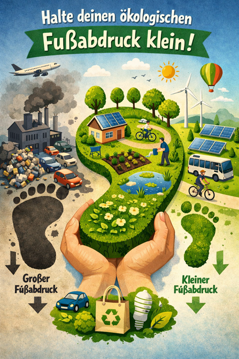Mit OpenAI DALL·E – KI-erstelltes Bild (ChatGPT_Image_24_Jan_2026_10_09_33) - Illustration zum Thema ökologischer Fußabdruck. Vergleich von großem und kleinem ökologischen Fußabdruck mit nachhaltigen und umweltschädlichen Beispielen. ökologischer Fußabdruck, Nachhaltigkeit, Umweltschutz, Achtsamkeit, bewusstes Leben, Yoga und Umwelt, nachhaltiger Lebensstil, Naturverbundenheit, Klimaschutz Das Thema ökologischer Fußabdruck steht in engem Zusammenhang mit Achtsamkeit, Ahimsa (Gewaltlosigkeit) und einem bewussten Lebensstil, wie er im Yoga gelehrt wird.