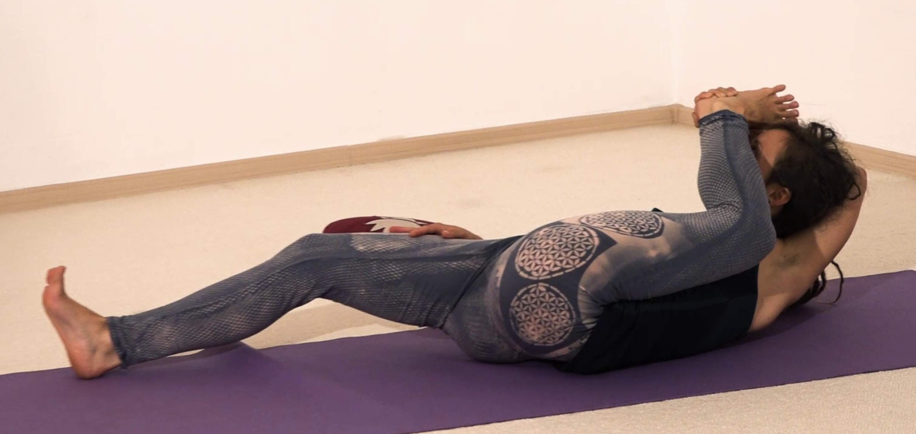 Fuß-zur-Nase-Stellung mit gebeugtem Knie, ein Asana aus dem Yoga Vidya Asana Portal. Aufnahme ca. 2018/2019, entnommen aus einem Yoga Video von Yoga Vidya. Viel Inspiration und Anleitung zu dieser Yoga Pose findest du in der Yoga Vidya App, sowie im Yoga Asana Portal, Stichwort [Fuß-zum-Kopf-Stellung Ekapada Shirasana]. Copyright Yoga Vidya e.V..