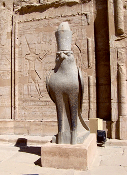 Horus ist die lateinisierte Form des ägyptischen Wortes, die auch als Hoher bezeichnet wird. Horus hat verschiedene Beinamen. Horus wird auf verschiedene Weisen dargestellt. Es gibt viele größere Horusdarstellungen. Z.B. gibt es beim Tempel von Ätphu eine wunderschöne Darstellung von Horus. Wenn man dort ist und den Horus anschaut und auf sich wirken lässt, spürt man eine besondere Kraft und Energie.