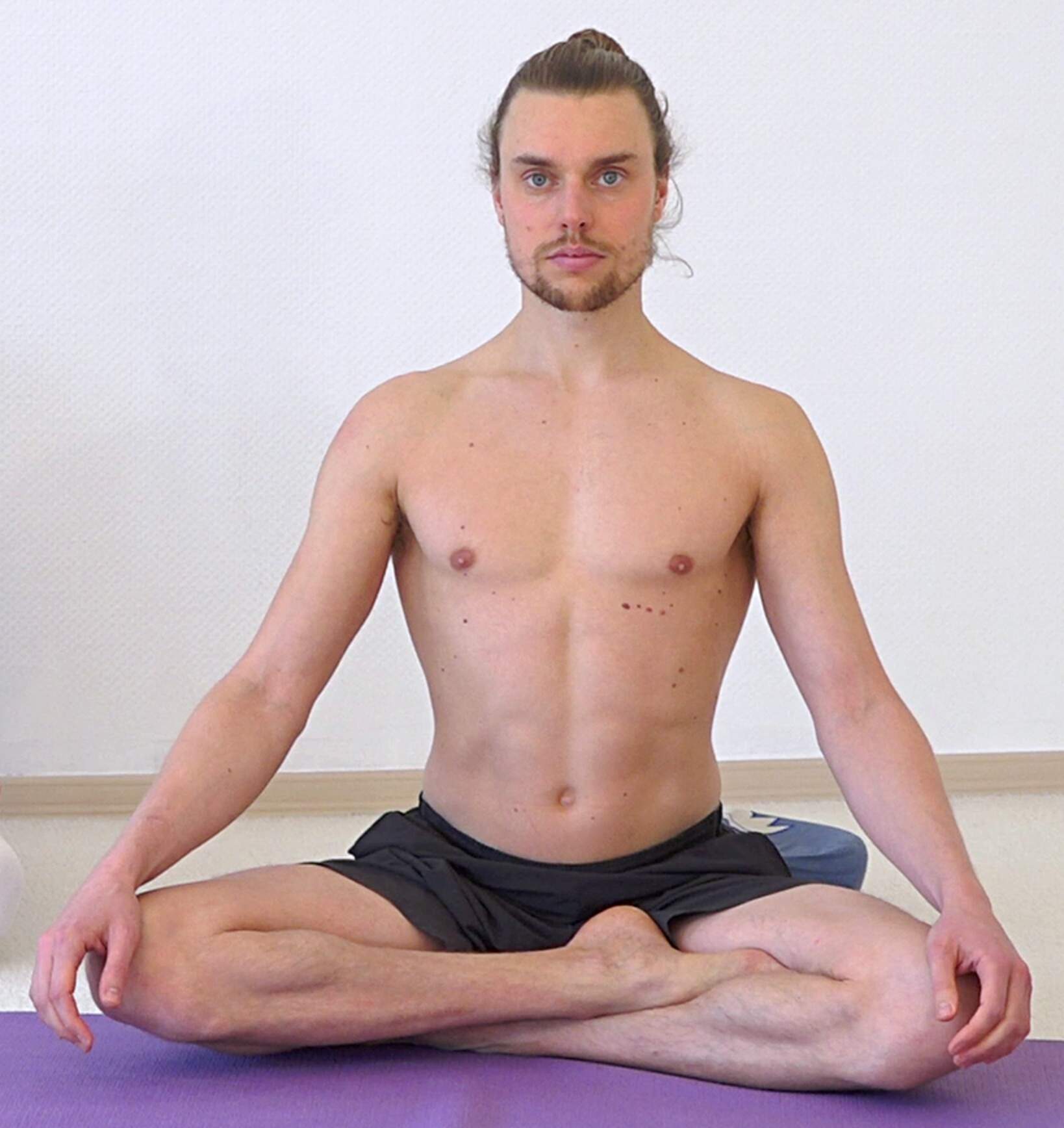 Atma Linasana, Stellung der Verborgenheit; die sich selbst umarmende Stellung, ein Yoga Asana für Mittelstufe. Atma Linasana ist eine Vorwärtsbeuge. Atma Linasana, Variation der Grundstellung Atma Linasana, ist eine Yoga Haltung aus der Asana Liste von A-Z. Regelmäßiges Üben von Yoga schenkt dir Entspannung, Gesundheit und Vitalität. Dieses Bild wurde auf den Yoga Vidya Seiten erstmal verwendet ab ca. 2021.