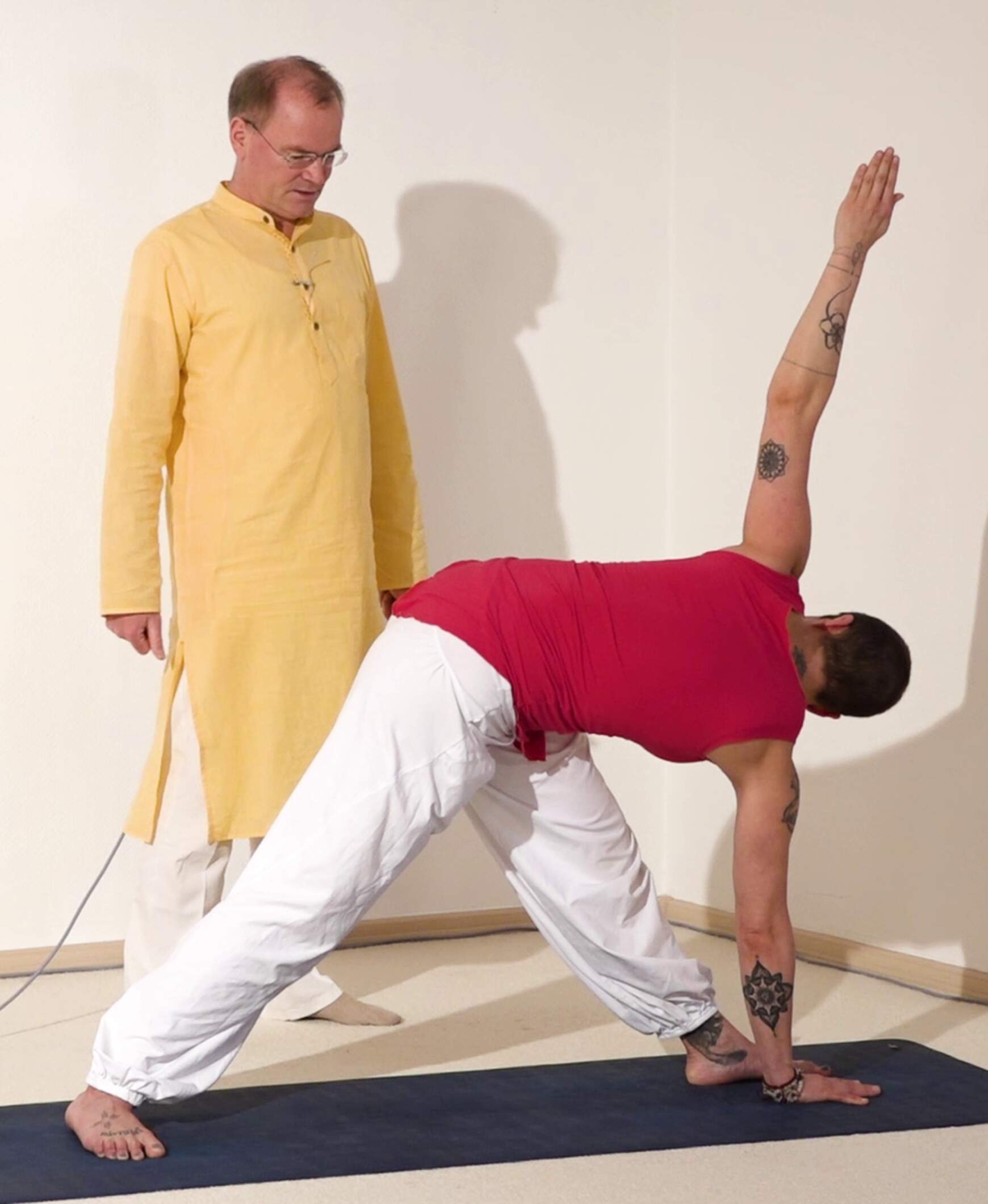 Gedrehtes Dreieck, Sanskrit Parivritta Trikonasana, ein Yoga Asana aus dem Yoga Vidya Asana Portal. Dieses Asana Foto wurde aufgenommen im Svadhishthana Raum von Yoga Vidya Bad Meinberg. Hilfen und Tipps zu dieser Yoga Haltung bekommst du in der Yoga Vidya App, sowie im großen Yoga Vidya Asana Portal, Stichwort Dreieck Trikonasana. Asanas, Pranayama, Tiefenentspannung bereiten auf die Meditation vor.