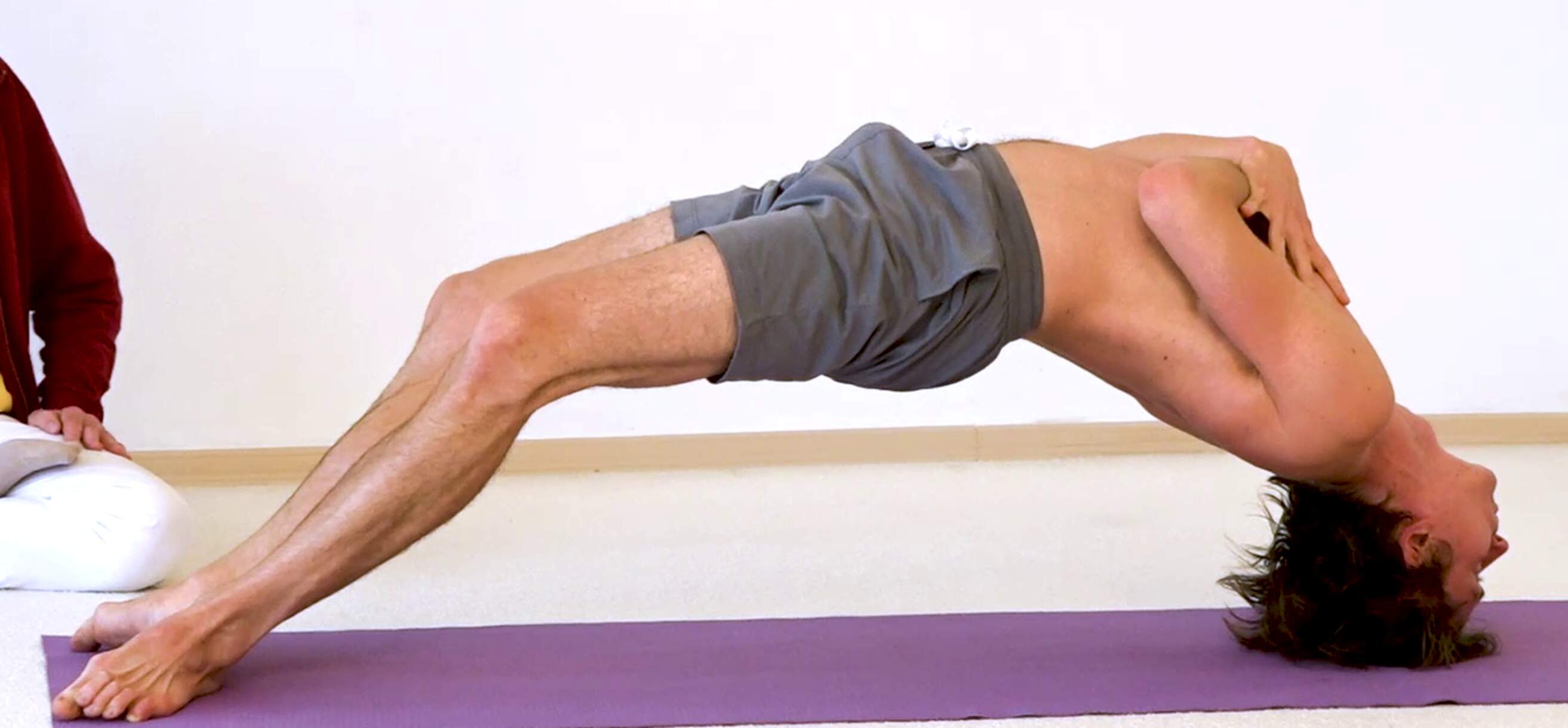 Nackenhaltung, Sanskrit Grivasana, eine Yoga Haltung aus der Asana Liste von A-Z. Aufnahme ca. 2018/2019, entnommen aus einem Yoga Video von Yoga Vidya. Viele Anregungen und Übungsanleitung zu diesem Yoga Asana findest du in der Yoga Vidya App, sowie im Yoga Vidya Asana Portal, Stichwort Rad Chakrasana. Regelmäßiges Üben von Yoga schenkt dir Entspannung, Gesundheit und Vitalität.
