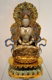 Quelle: https://commons.wikimedia.org/wiki/File:Vairochana_Buddha,_China,_Qing_dynasty,_19th_century_AD,_jade,_gilt_bronze,_enamel,_pearls,_kingfisher_feathers_-_Royal_Ontario_Museum_-_DSC03754.JPG Lizenz: https://creativecommons.org/publicdomain/zero…
