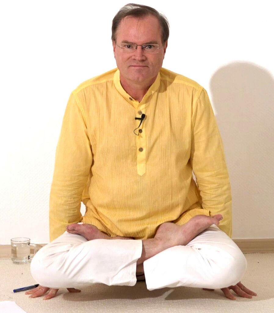Yoga Hahnenstellung auf den Fingerspitzen, eine Yoga Haltung aus der Asana Liste von A-Z. Dies ist Foto aus einem Yoga Video von Yoga Vidya, größter Anbieter von Yogalehrer Ausbildungen im deutschsprachigen Raum. Praktische Anleitungen mit Wirkungen und Konzentrationshilfen gibt es in der Yoga Vidya App, sowie im Yoga Vidya Asana Portal, Stichwort Hahn Kukkutasana. Asanas, Pranayama, Tiefenentspannung bereiten auf die Meditation vor.