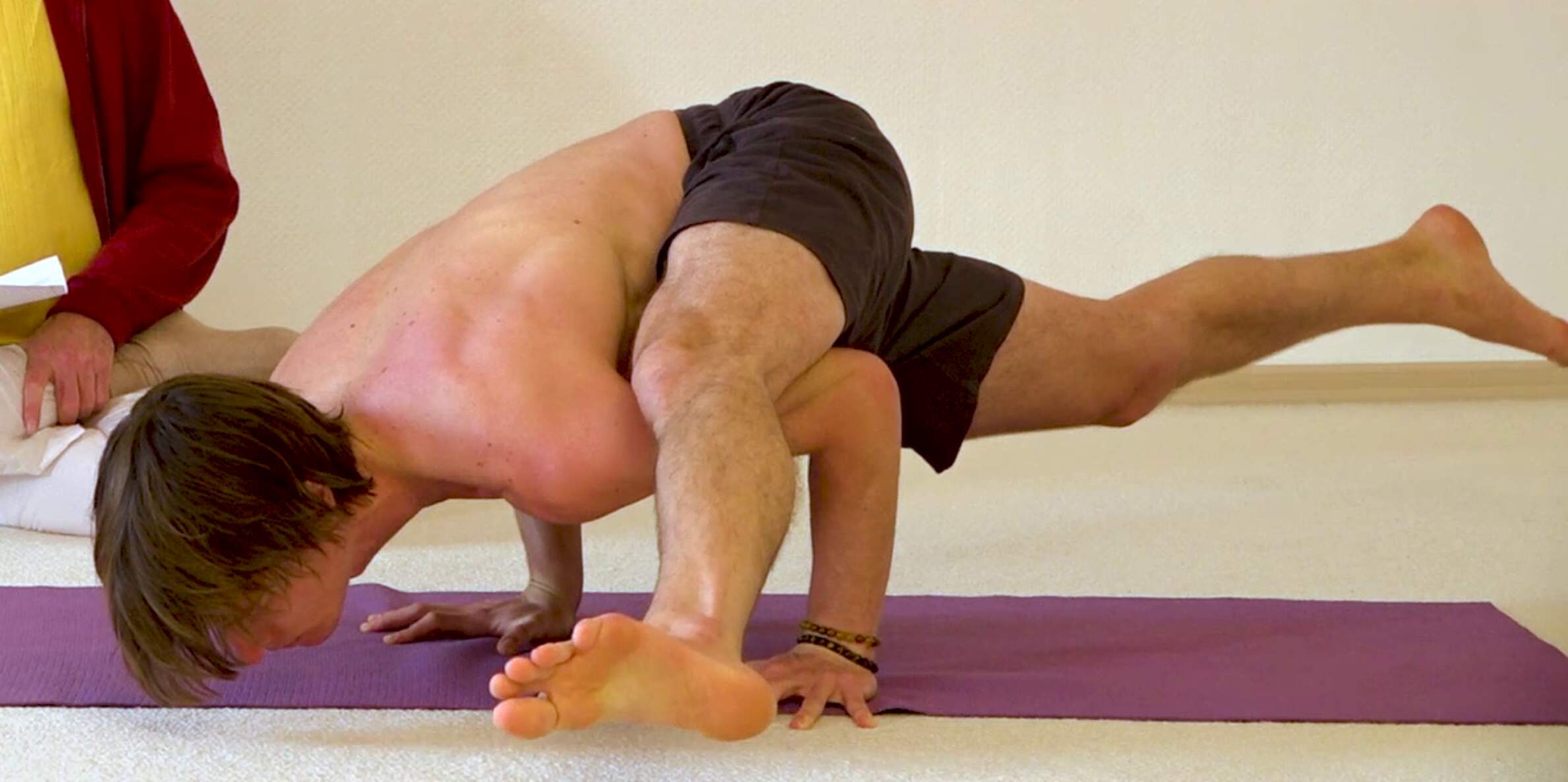 Einbeinige Stellung des Kaundinya, Sanskrit Eka Pada Kaundinyasana, eine Yoga Position aus dem Yoga Vidya Asana Lexikon. Dies ist Foto aus einem Yoga Video von Yoga Vidya, größter Anbieter von Yogalehrer Ausbildungen im deutschsprachigen Raum. Regelmäßiges Üben von Yoga schenkt dir Entspannung, Gesundheit und Vitalität.