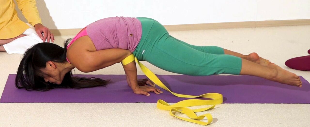 Pfau mit Gurt, eine Yoga Stellung, über die du mehr findest im Yoga Vidya Asana Portal. Dieses Foto stammt aus dem Jahr 2018/2019, wurde aufgenommen bei Yoga Vidya, Europas großes Netzwerk von Yogalehrern und Yogalehrerinnen. Viele Anregungen und Anleitung zu dieser Yoga Position findest du in der Yoga Vidya App, sowie im Yoga Vidya Asana Portal, Stichwort Pfau Mayurasana. Copyright Yoga Vidya e.V..