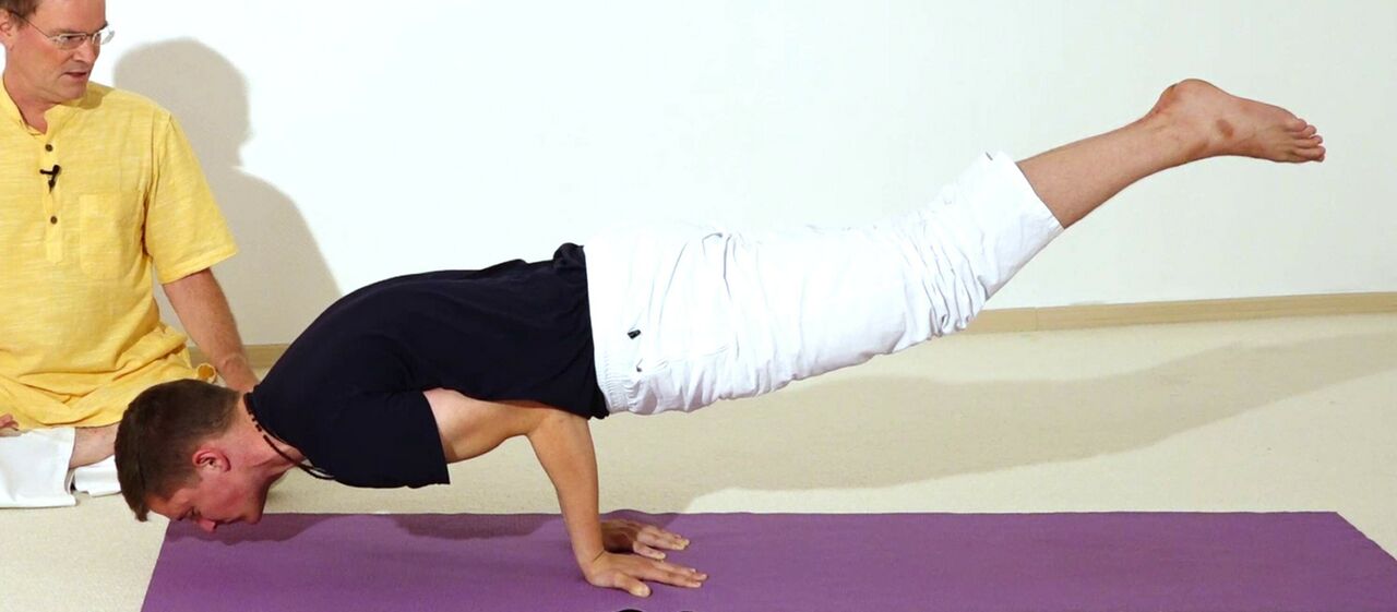 Yoga Pfau, Sanskrit Mayurasana, eine Yoga Stellung aus der Asana Liste von A-Z. Dieses Asana Foto stammt aus einem Yoga Video von Yoga Vidya, Teil des Yoga Vidya Asana Lexikons. Hilfen und Tipps zu dieser Yoga Haltung bekommst du in der Yoga Vidya App, sowie im großen Yoga Vidya Asana Portal, Stichwort Pfau Mayurasana. Übe regelmäßig Yoga und Meditation für Gesundheit, Vitalität und Gelassenheit.