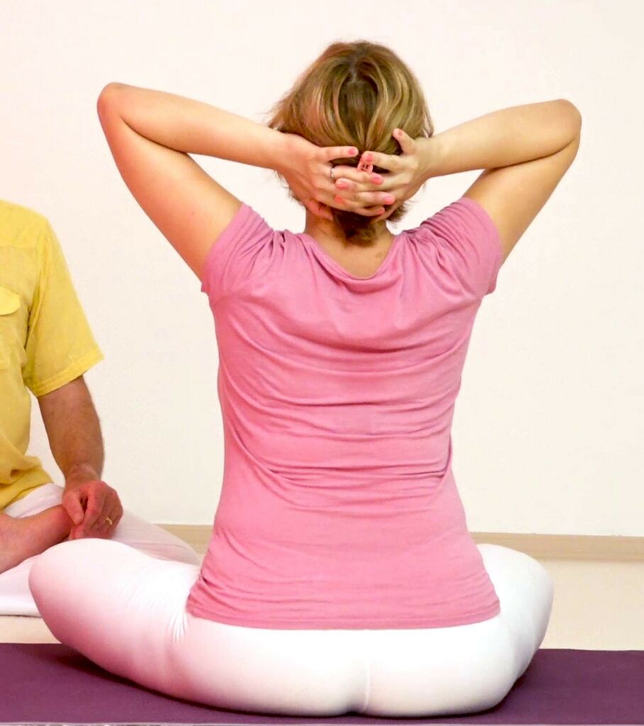 Nackenmuskeln stärken, eine Yoga Position, über die du mehr findest im Yoga Vidya Asana Portal. Dieses Bild ist ein Video Snapshot aus dem Jahr 2019/2019. Übe regelmäßig Yoga und Meditation für Gesundheit, Vitalität und Gelassenheit.