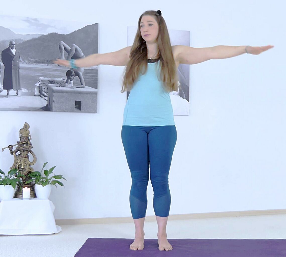 Kulala Chakrasana, Töpferscheibe; Drehung im Stehen, eine Yoga Pose für Anfänger. Kulala Chakrasana ist eine Dynamische Übung für die Hände. Kulala Chakrasana ist eine Yoga Haltung, zu der du viele Tipps bekommst im Asana Lexikon von Yoga Vidya. Regelmäßiges Üben von Yoga schenkt dir Entspannung, Gesundheit und Vitalität. Foto aufgenommen vermutlich in den Jahren 2019-2021.