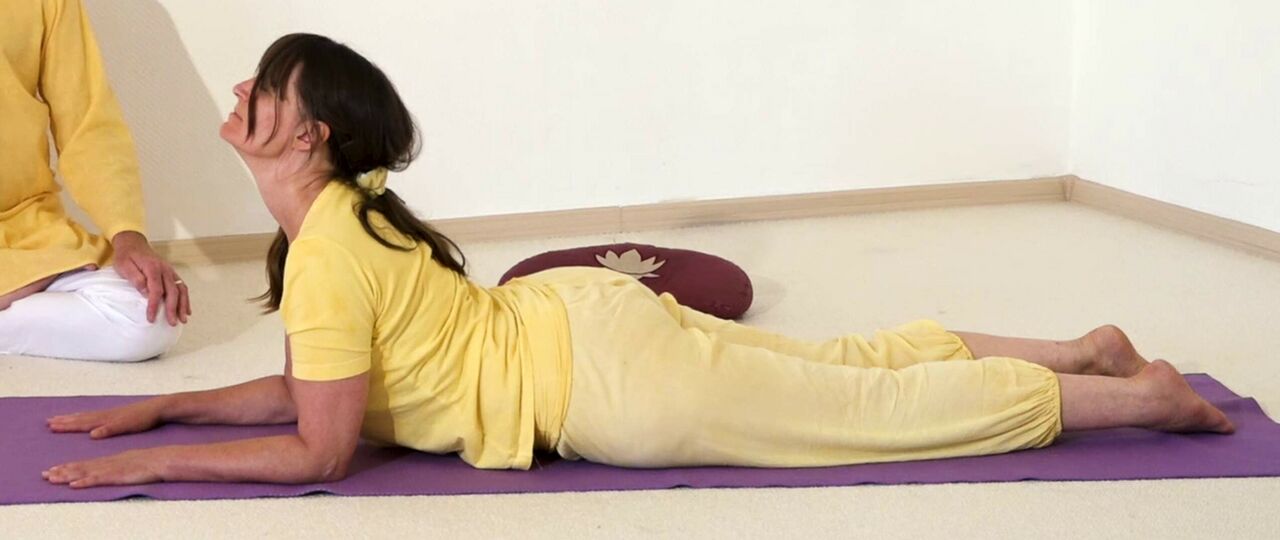Haltung der Sphinx, Sanskrit Salamba Bhujangasana, eine Yogastellung, zu der du viele Tipps bekommst im Asana Lexikon von Yoga Vidya. Dieses Foto wurde aufgenommen aus einem Yoga Video von Yoga Vidya, Europas großes Netzwerk von Yogalehrern und Yogalehrerinnen. Viel Inspiration und Anleitung zu dieser Yoga Pose findest du in der Yoga Vidya App, sowie im Yoga Asana Portal, Stichwort [httsp://www.yoga-vidya.de/yoga-uebungen/asana/kobra-17/ Kobra Bhujangasana]. Asanas, Pranayama, Tiefenentspannung bereiten auf die Meditation vor.