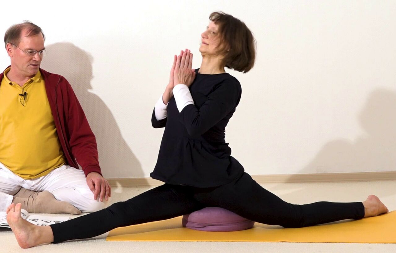 Mit Kissen gestützter Spagat, eine Stellung, über die du mehr findest im Yoga Vidya Asana Portal. Dieses Foto ist ein Screen Shot aus dem Jahr 2018/2019. Hilfen und Tipps zu dieser Yoga Position bekommst du in der Yoga Vidya App, sowie im Yoga Vidya Asana Portal, Stichwort Spagat Hanumanasana. Yoga Übungen machen Spaß, sind gesund und helfen der spirituellen Entwicklung.