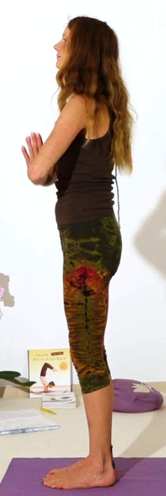 Sonnengruß mit Navarna Shakti Mantra, eine Yoga Position aus der Asana Liste von A-Z. Dieses Foto wurde aufgenommen aus einem Yoga Video von Yoga Vidya, Europas großes Netzwerk von Yogalehrern und Yogalehrerinnen. Mehr Infos und Anleitung zu dieser Yoga Stellung findest du in der Yoga Vidya App, sowie im großen Yoga Vidya Asana Portal, Stichwort Sonnengruß Surya Namaskar. Copyright Yoga Vidya.
