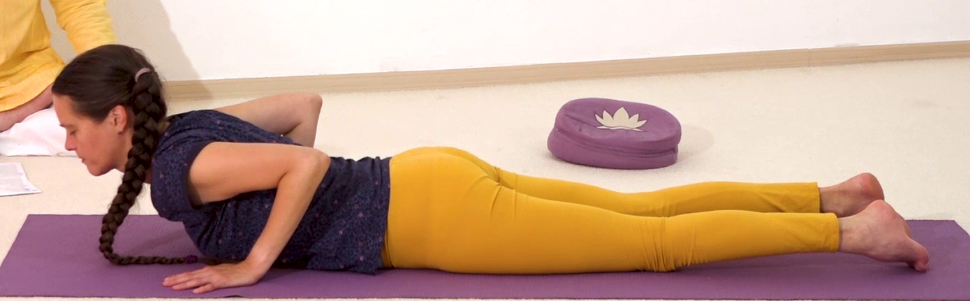 Kapalabhati in der Kobra, eine Yoga Stellung, über die du mehr findest im Yoga Vidya Asana Portal. Dieses Asana Foto wurde aufgenommen im Svadhishthana Raum von Yoga Vidya Bad Meinberg. Mehr Infos und Anleitung zu dieser Yoga Stellung findest du in der Yoga Vidya App, sowie im großen Yoga Vidya Asana Portal, Stichwort [Kobra Bhujangasana]. Regelmäßiges Üben von Yoga schenkt dir Entspannung, Gesundheit und Vitalität.