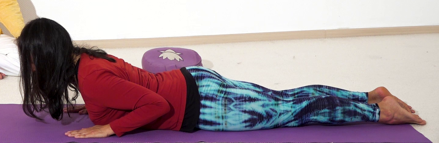 Kobra mit Bauchatmung, eine Yoga Übung aus dem Yoga Vidya Asana Lexikon. Aufnahme ca. 2018/2019, entnommen aus einem Yoga Video von Yoga Vidya. Praktische Anleitung zu dieser Yoga Übung bekommst du auf dem Yoga Vidya Asana Portal, Stichwort [Kobra Bhujangasana]. Tägliche Yoga Praxis hält gesund, gibt Energie und Gelassenheit und führt zu spiritueller Erweckung.