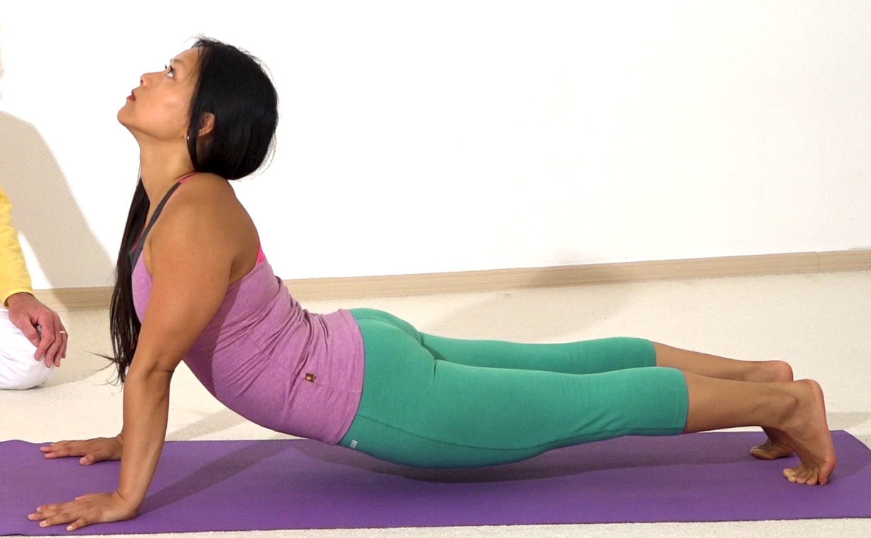 Kobrastellung mit aufgestellten Füßen, eine Yoga Haltung, zu der du viele Tipps bekommst im Asana Lexikon von Yoga Vidya. Aufnahme ca. 2018/2019, entnommen aus einem Yoga Video von Yoga Vidya. Viel Inspiration und Anleitung zu dieser Yoga Pose findest du in der Yoga Vidya App, sowie im Yoga Asana Portal, Stichwort [Kobra Bhujangasana]. Copyright Yoga Vidya e.V..