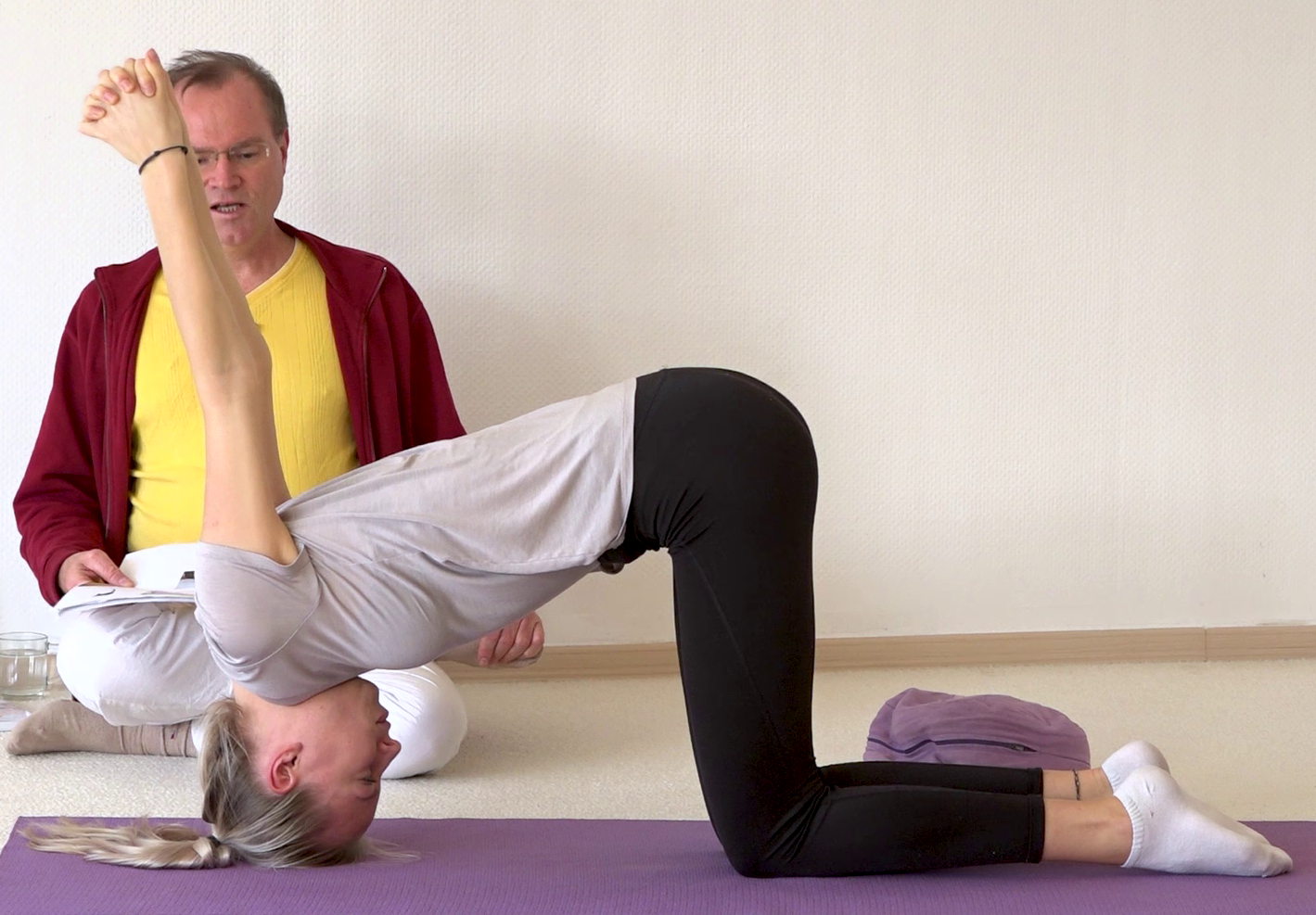 Kopfstand auf Mondhaltung (Shirashashankasana), ein Asana aus dem Yoga Vidya Asana Portal. Dieses Asana Foto wurde aufgenommen im Svadhishthana Raum von Yoga Vidya Bad Meinberg. Viel Inspiration und Anleitung zu dieser Yoga Haltung findest du in der Yoga Vidya App, sowie im großen Yoga Vidya Asana Portal, Stichwort [Kopfstand Shirshasana]. Regelmäßiges Üben von Yoga schenkt dir Entspannung, Gesundheit und Vitalität.