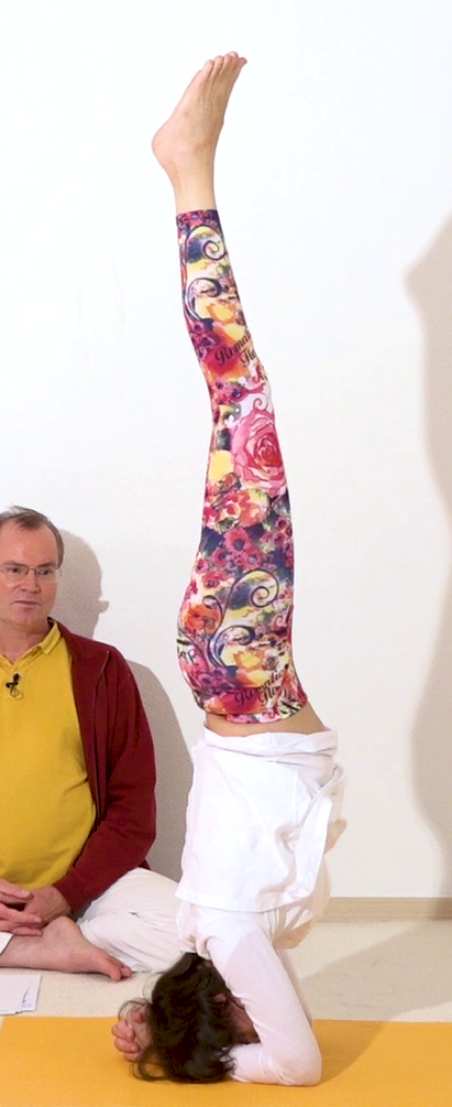 Kopfstand mit Konzentration auf Anahata Chakra, eine Stellung aus der Asana Liste von A-Z. Dieses Foto wurde aufgenommen aus einem Yoga Video von Yoga Vidya, Europas großes Netzwerk von Yogalehrern und Yogalehrerinnen. Mehr Infos und Anleitung zu dieser Yoga Stellung findest du in der Yoga Vidya App, sowie im großen Yoga Vidya Asana Portal, Stichwort [Kopfstand Shirshasana]. Übe regelmäßig Yoga und Meditation für Gesundheit, Vitalität und Gelassenheit.