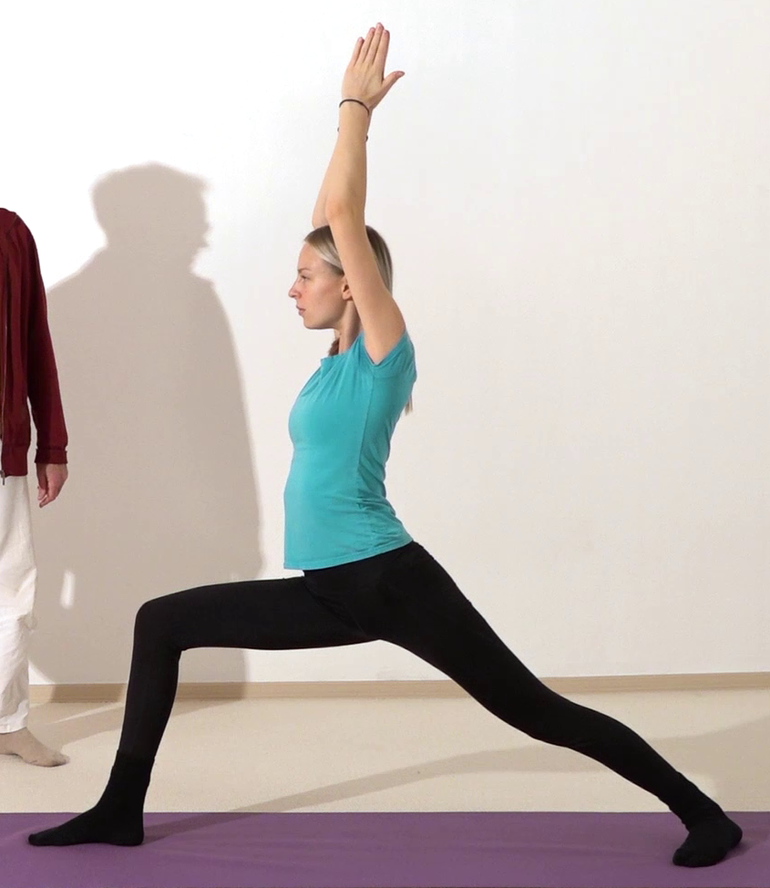 Krieger I, eine Yoga Haltung, über die du mehr findest im Yoga Vidya Asana Portal. Dieses Foto stammt aus dem Jahr 2018/2019, wurde aufgenommen bei Yoga Vidya, Europas großes Netzwerk von Yogalehrern und Yogalehrerinnen. Hilfen und Tipps zu dieser Yoga Position bekommst du in der Yoga Vidya App, sowie im Yoga Vidya Asana Portal, Stichwort [Held Virabhadrasana]. Übe regelmäßig Yoga und Meditation für Gesundheit, Vitalität und Gelassenheit.