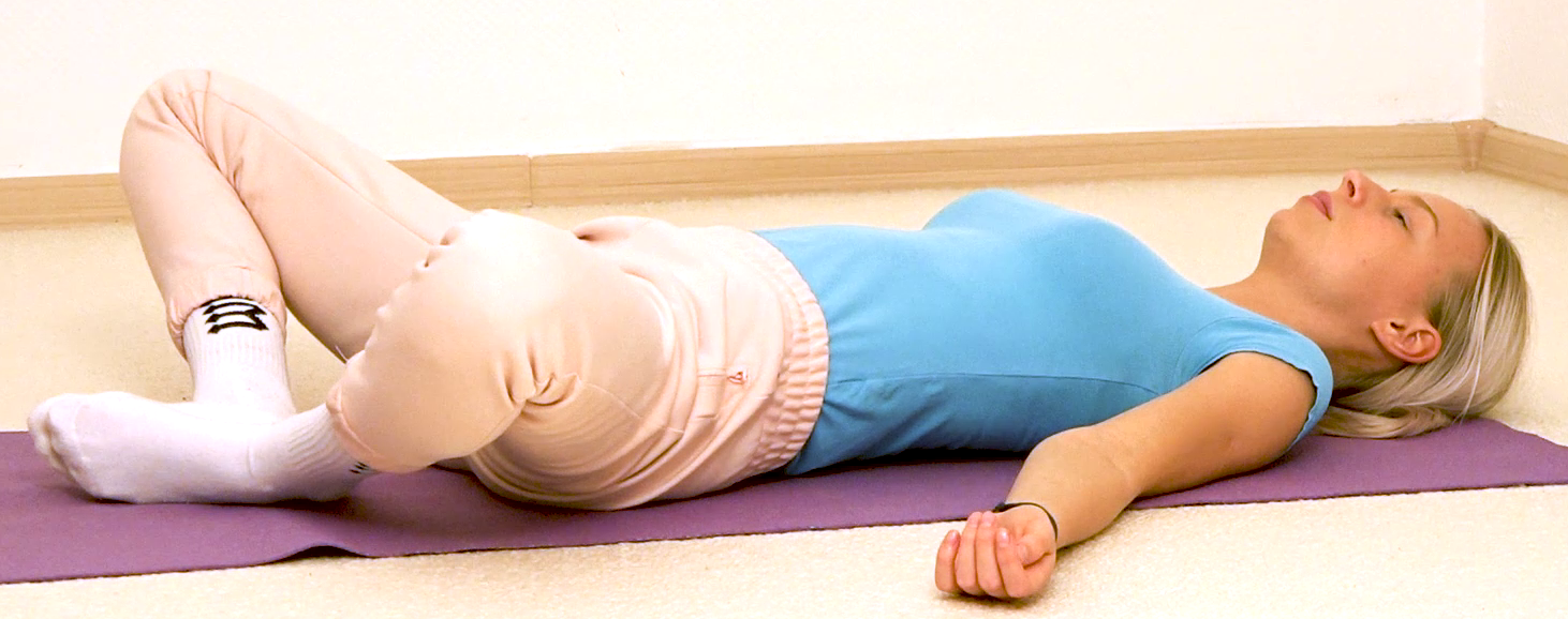 Liegende gebogene Winkelhaltung, Sanskrit Supta Bhadrasana, eine Yoga Position aus der Asana Liste von A-Z. Dieses Foto ist ein Screen Shot aus dem Jahr 2018/2019. Übe regelmäßig Yoga und Meditation für Gesundheit, Vitalität und Gelassenheit.
