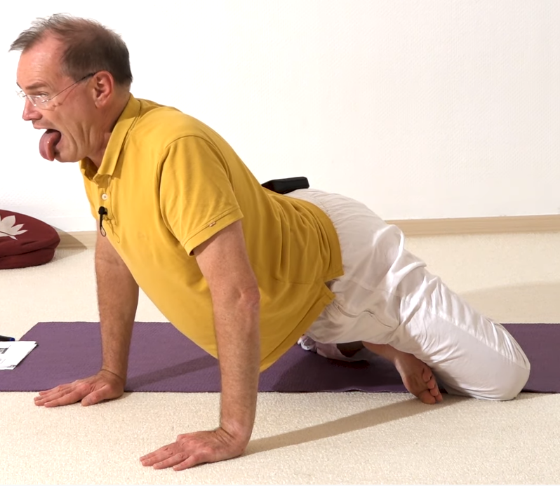 Löwe Stellung aus der Lotus-Kobra - Simhasana, eine Yogastellung aus dem Yoga Vidya Asana Portal. Dieses Asana Foto wurde aufgenommen im Svadhishthana Raum von Yoga Vidya Bad Meinberg. Tägliche Yoga Praxis hält gesund, gibt Energie und Gelassenheit und führt zu spiritueller Erweckung.