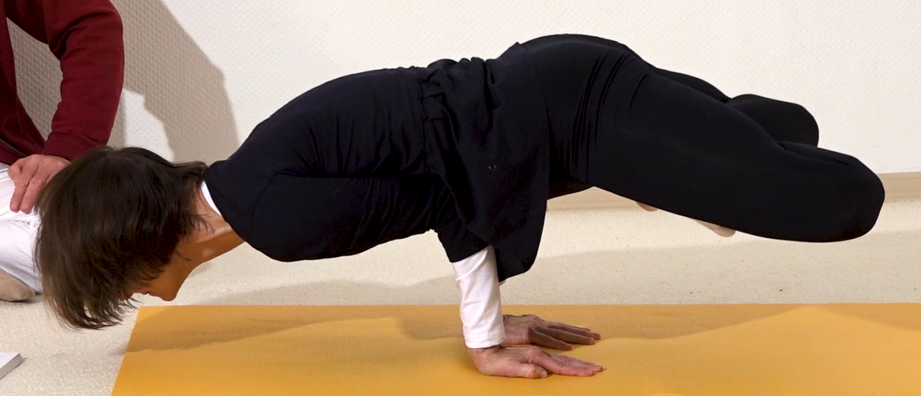 Lotus-Pfau, ein Asana, zu der du viele Tipps bekommst im Asana Lexikon von Yoga Vidya. Ein Foto aus einem Video von Yoga Vidya, größter Anbieter von Yogalehrer Ausbildungen im deutschsprachigen Raum. Viele Anregungen und Anleitung zu dieser Yoga Position findest du in der Yoga Vidya App, sowie im Yoga Vidya Asana Portal, Stichwort [Pfau Mayurasana]. Yoga Übungen machen Spaß, sind gesund und helfen der spirituellen Entwicklung.