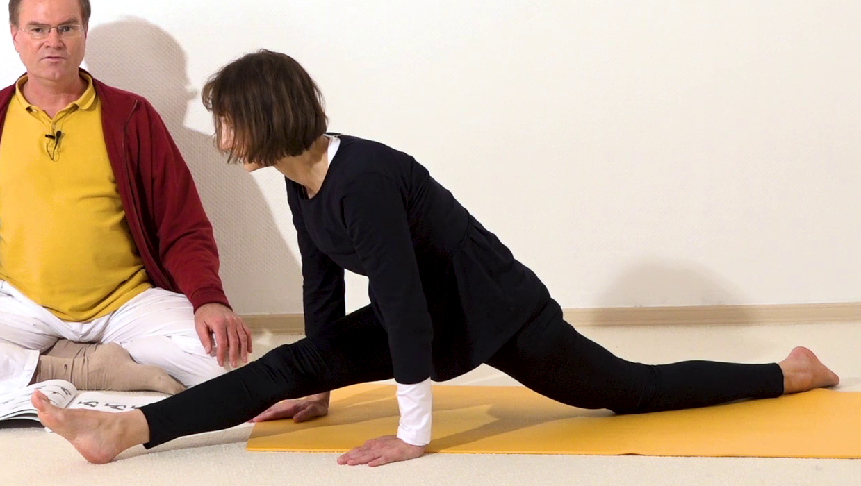 Mit Händen unterstützter Spagat, eine Yoga Haltung aus dem Yoga Vidya Asana Portal. Dies ist Foto aus einem Yoga Video von Yoga Vidya, größter Anbieter von Yogalehrer Ausbildungen im deutschsprachigen Raum. Hilfen und Tipps zu dieser Yoga Haltung bekommst du in der Yoga Vidya App, sowie im großen Yoga Vidya Asana Portal, Stichwort [Spagat Hanumanasana]. Copyright Yoga Vidya.