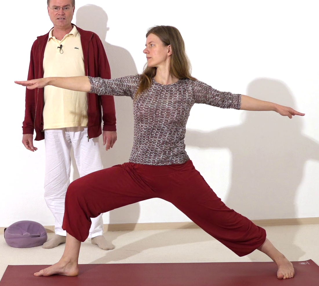 Mutiger Krieger, Sanskrit Vira Bhadrasana, eine Yogastellung, zu der du viele Tipps bekommst im Asana Lexikon von Yoga Vidya. Dieses Foto stammt aus dem Jahr 2018/2019, wurde aufgenommen bei Yoga Vidya, Europas großes Netzwerk von Yogalehrern und Yogalehrerinnen. Praktische Anleitung zu dieser Yoga Übung bekommst du auf dem Yoga Vidya Asana Portal, Stichwort [Held Vira Bhadrasana]. Asanas, Pranayama, Tiefenentspannung bereiten auf die Meditation vor.
